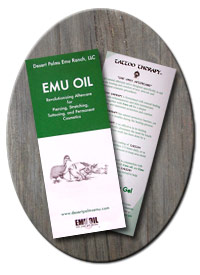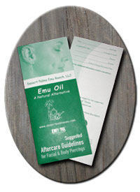 Emu Oil Aftercare Brochure This tri-fold brochure explains the benefits and suggested aftercare usage of Emu Oil. It also features Comes packaged in 25. ($5.00) |